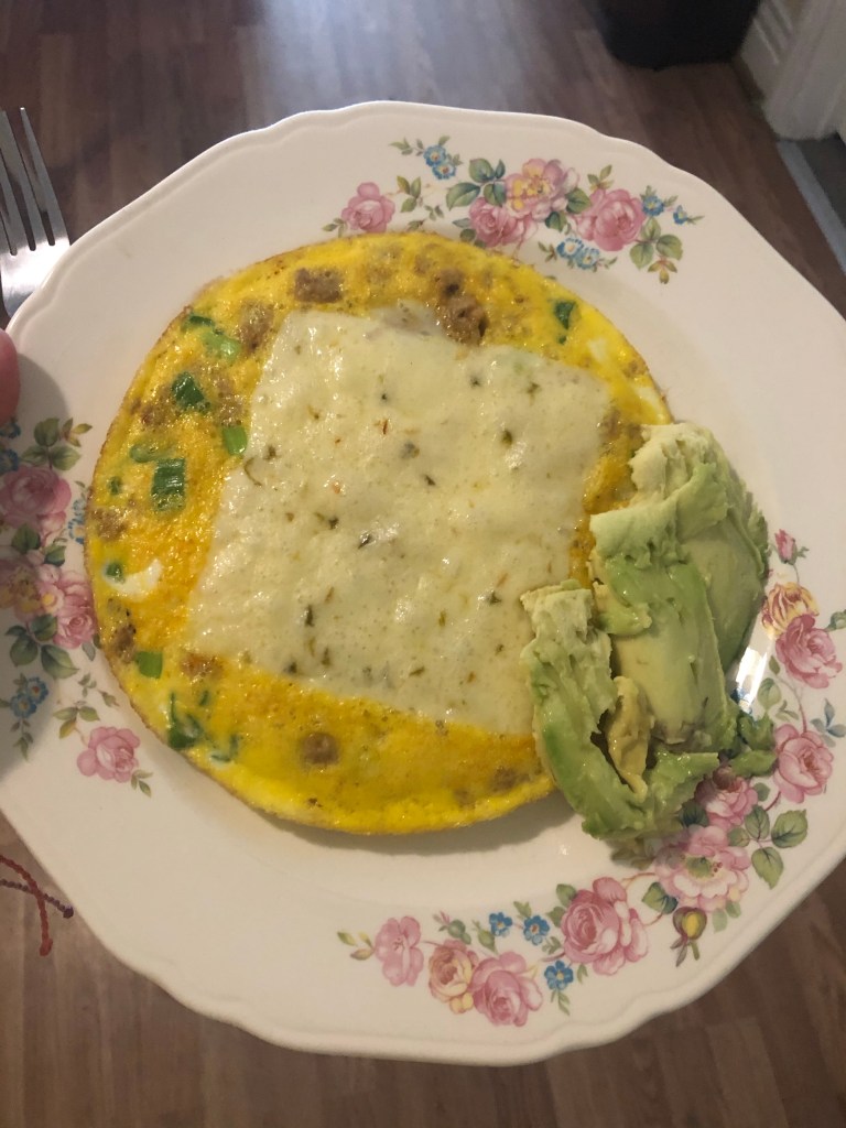 I’ve done good though being good to my body with food. Still no gluten. Still eating healthy. Just for today. So today I leave you with a photo of my yummy and healthy egg frittata with avocados from a friends tree that finally ripened. Until tomorrow.